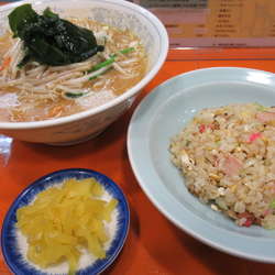 チャーハンはしっとりしていて、塩気も丁度良く、ご飯や具材の微かなこげが香ばしい。具は、刻み葱。玉子。刻んだなると。チャーシューは刻んだブロック状ではなく、薄切りのハムを刻んだような柔らかなもので、これはこれでおいしかった。ほか、小皿で沢庵の細切りが提供された。スープは、ラーメンとのセットだったので、ついてこなかった。