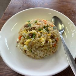 米パラパラ、具材はチャーシュー片にネギなど。