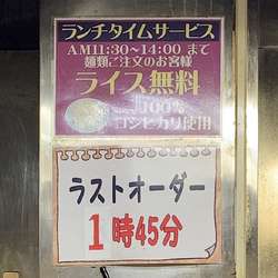 | 営業時間 | 土曜日 11時30分〜14時45分 17時00分〜3時45分 日曜日 11時30分〜14時45分 17時00分〜3時45分 月曜日 11時30分〜14時45分 17時00分〜3時45分 木曜日 11時30分〜14時45分 17時00分〜3時45分 金曜日 11時30分〜14時45分 17時00分〜3時45分 |