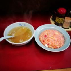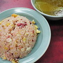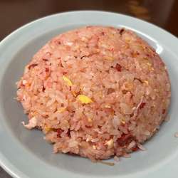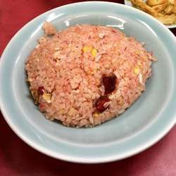 見た目は赤いチャーハンパラパラでしっかり美味しいチャーハンです。毎週食べたいです。