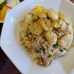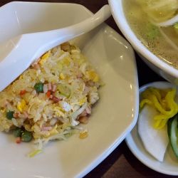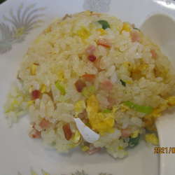 頭に海老がのっかり、具沢山でパラパラチャーハン。