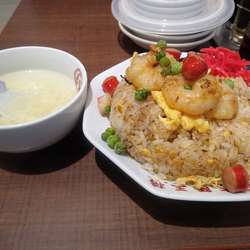 チャーハンの上にグリーンピース、紅生姜、ナルト、赤ウインナー、玉子、エビが乗っています