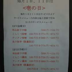 毎月1日と11日はサービスDAY。サービスメニューの内容は毎月店頭で告知。(店内写真参照)