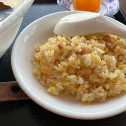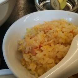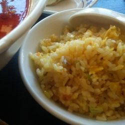 付け合わせの炒飯にエビ湯麺のエビを載せてエビ炒飯に勝手に変更。