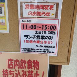 | 営業時間 | 11:30~15:00 土・日・祝 11:00~15:30 ※スープ切れで終了 |